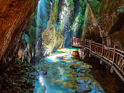 朝陽地縫一線天景區(qū)位于張家界慈利縣趙家埡水庫底部,是一個外河流入型的水底大溶洞,洞高30—80m,寬道5—25m,全長1550m,洞穴廊道呈峽谷狀態(tài),走向由南向北穿山而過,落差80余米,形成于高山峰叢喀斯特峽谷流域,深切河床滲漏石灰?guī)r斷層層里裂隙,向含水層集中循環(huán),再經溶蝕、侵蝕崩塌作用,形成與原河道平行的地下通道,是喀斯特區(qū)過境河的伏流河。